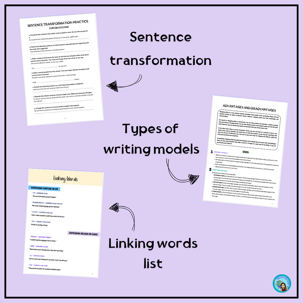pdf con ejemplos de writing, lista de linking words y ejercicios de sentence transformation.