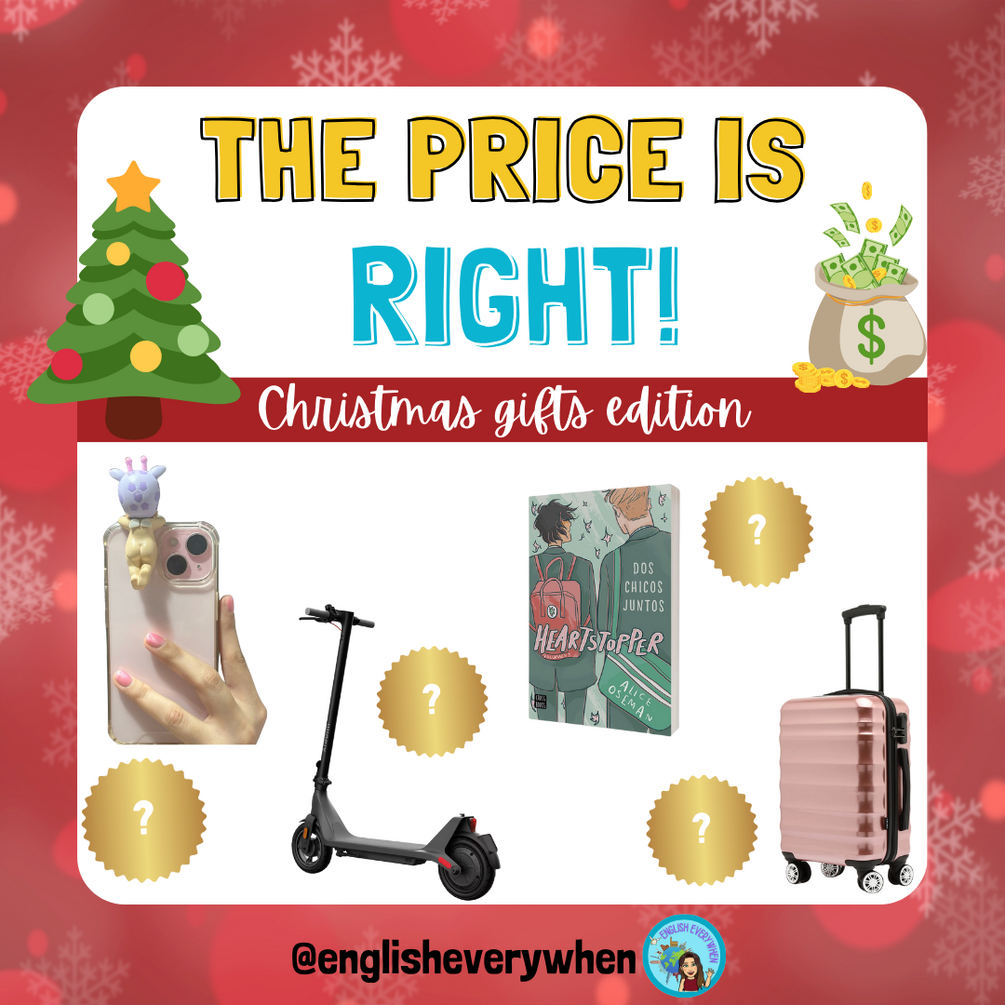 Es el mismo juego que el original, pero con un toque navideño para aprovechar el tirón post-fiestas. 🎁 Presenta a tus alumnos diferentes regalos típicos de Navidad y pídeles que adivinen su precio en inglés. El reto: ¡acercarse lo máximo posible sin pasarse! 🎯